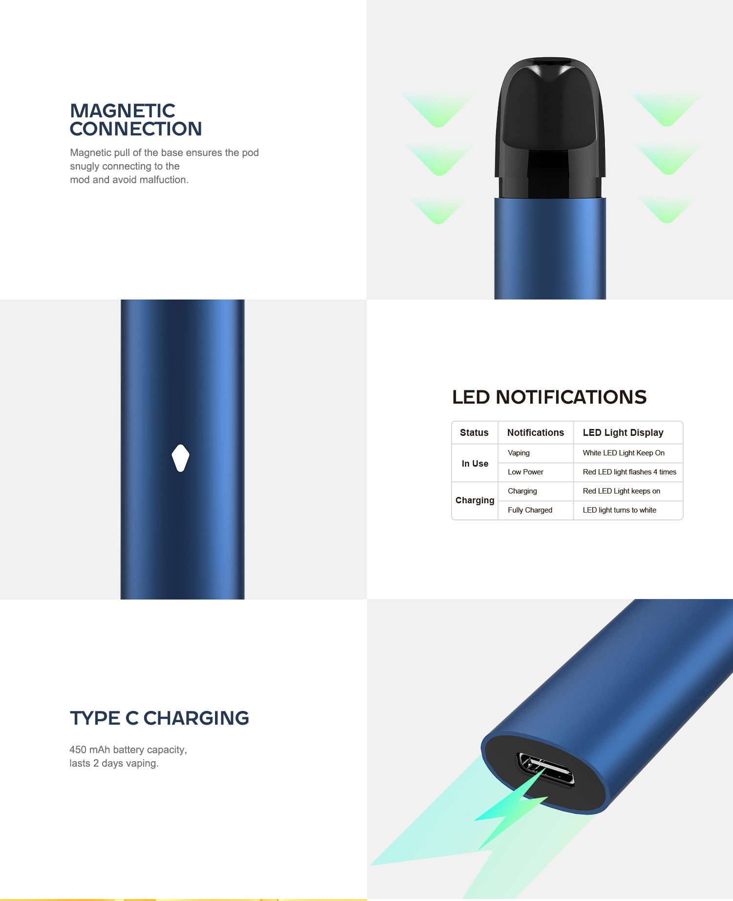 -450mAh rechargeable battery, with Type-C USB charger.